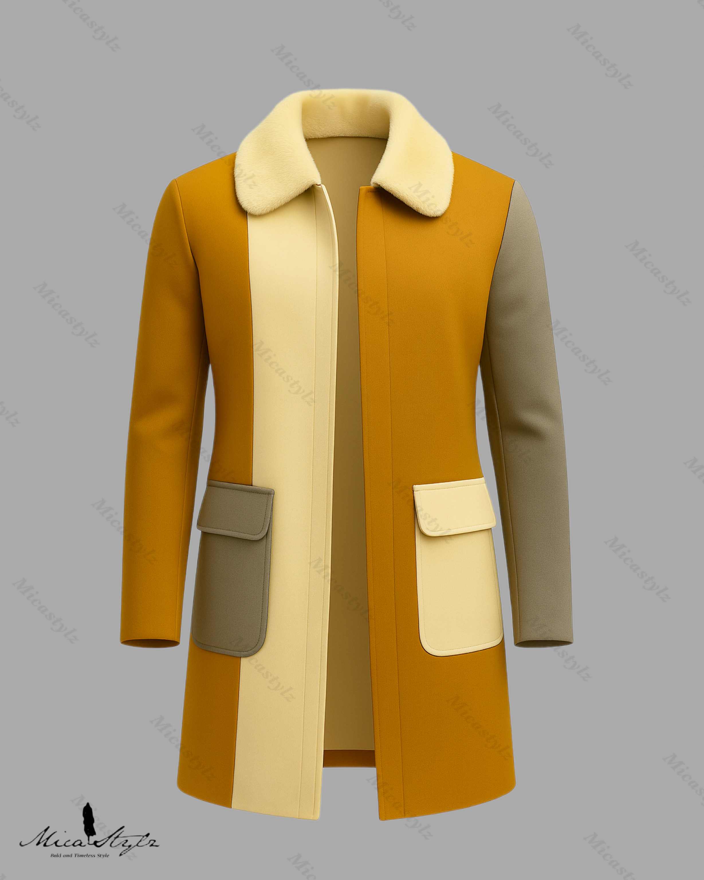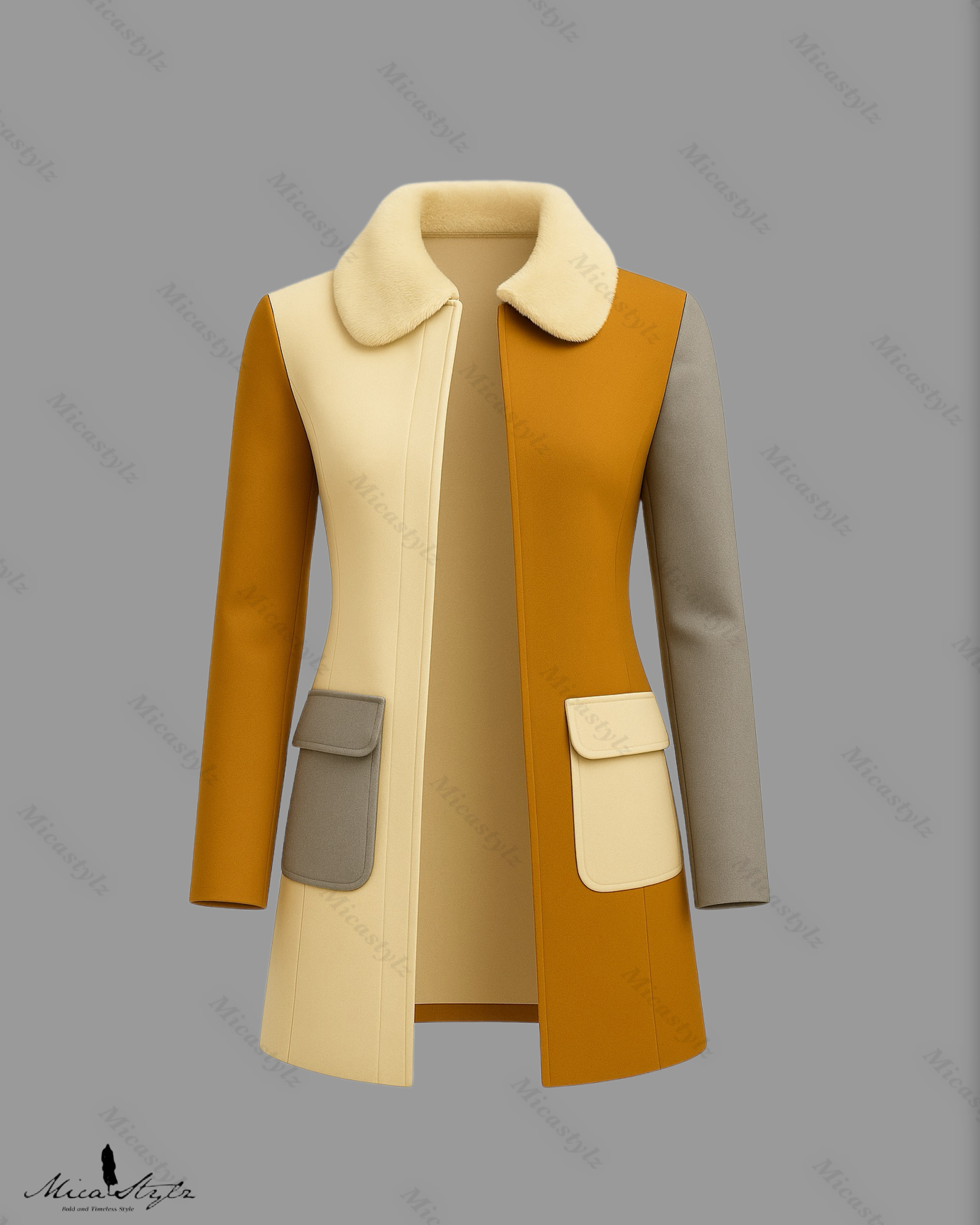 Medium-length tailored coat featuring a graphic quad-color design (ochre, cream, grey). Features a plush faux-fur collar and flap patch pockets, inspired by 1960s Mod aesthetics.