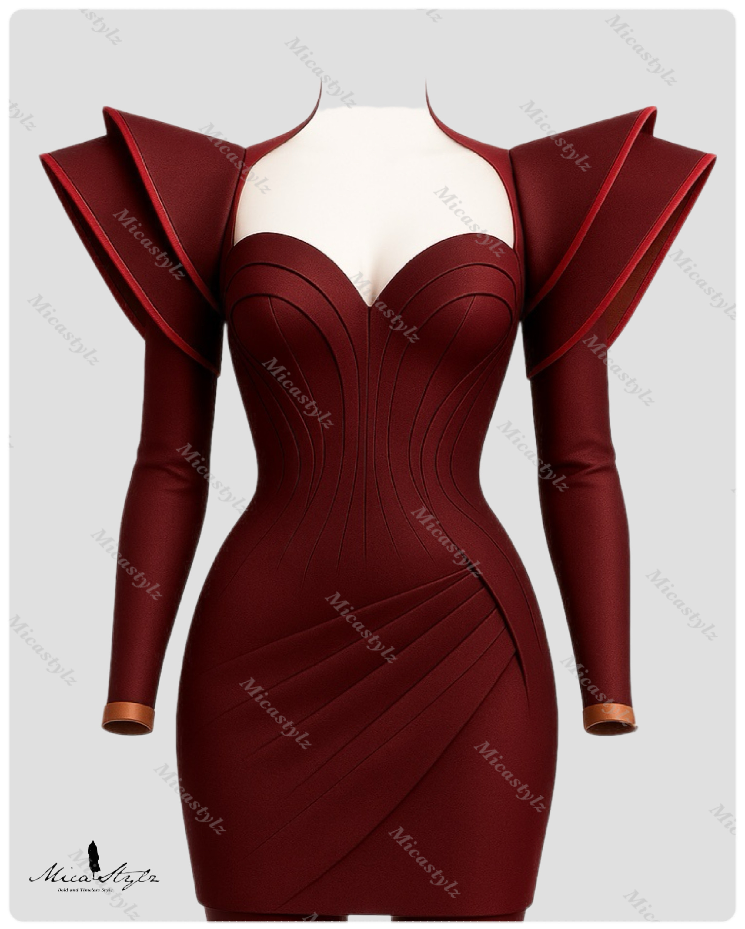 Form-fitting burgundy gown with visible corsetry lines. Defined by dramatic, sculptural, layered wing shoulders and a sweetheart neckline framed by a high yoke.