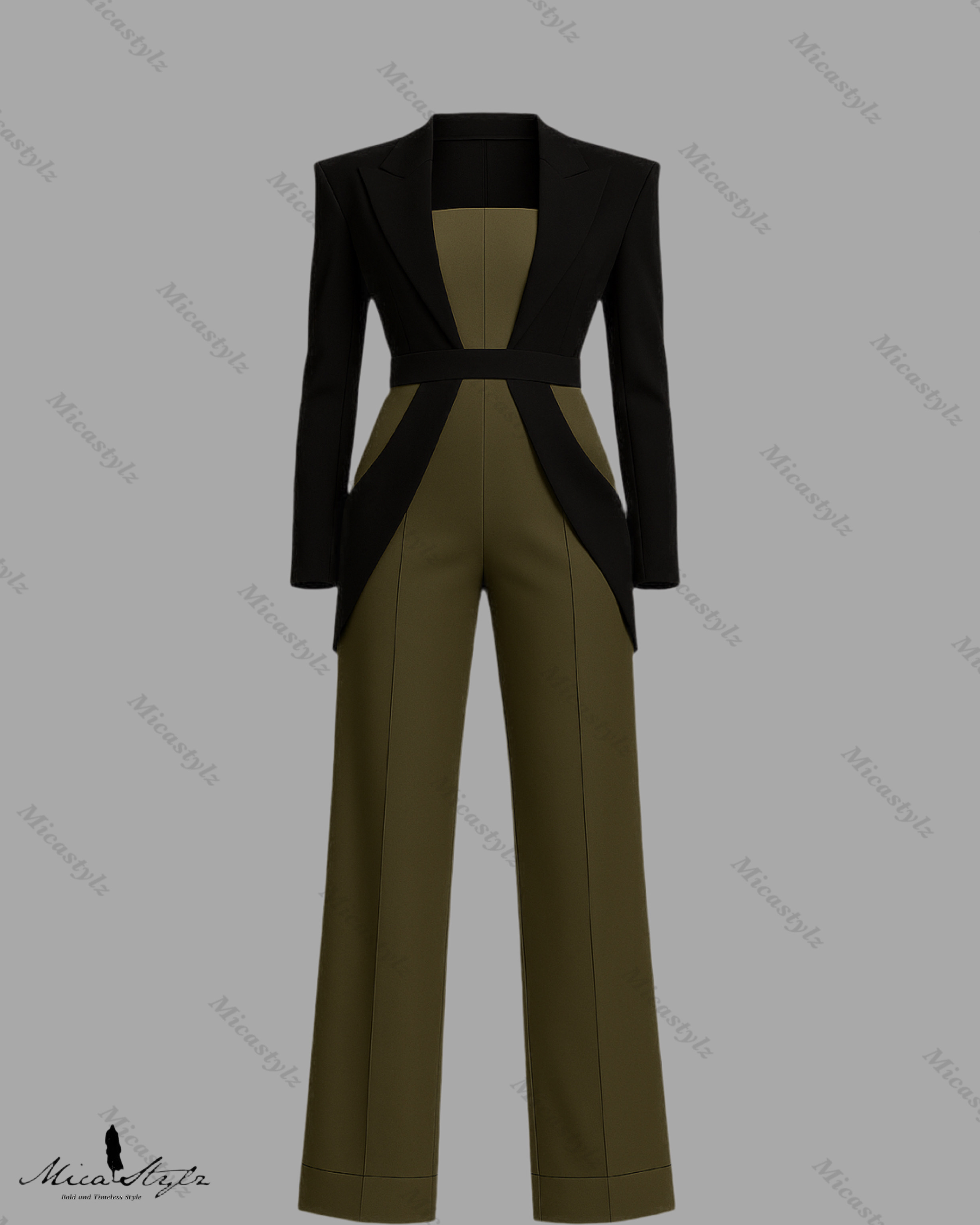 Olive-green wide-leg jumpsuit with an integrated, sharp black overlay that functions as a cropped, architectural blazer/belt, creating a graphic, cinched silhouette.